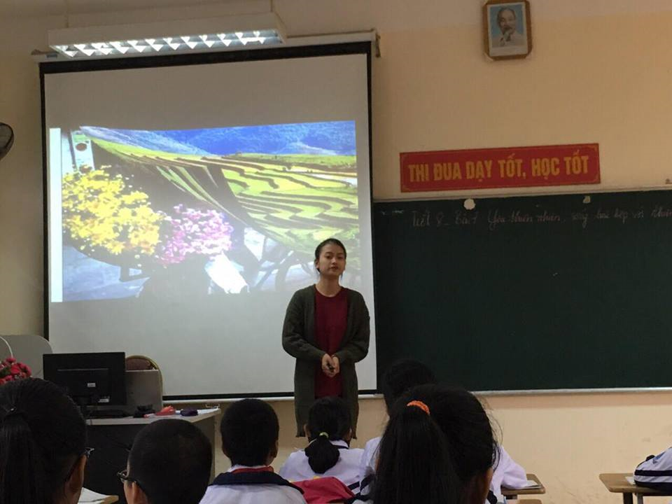 Với bài giảng “ Yêu thiên nhiên sống hòa hợp với thiên nhiên”,cô Nam không chỉ đưa ra lý thuyết, khái niệm đơn thuần mà cô còn chú trọng xây dựng các câu hỏi để học sinh tham gia vào bài học. Bài giảng bằng giáo án điện tử được thiết kế nổi bật, hình ảnh minh họa sinh động giới thiệu hàng loạt các danh lam, thắng cảnh đẹp trên đất nước Việt Nam như: Động Phong Nha Kẻ Bàng, Vịnh Hạ long, Hội An…nhằm thúc đẩy tình yêu thiên nhiên, quê hương đất nước của học sinh. Song song là những hình ảnh về vai trò của thiên nhiên đối với đời sống vật chất và tinh thần của con người cũng như trách nhiệm của học sinh trong việc gìn giữ và bảo vệ thiên nhiên. Bên cạnh đó, cô còn tổ chức cho các em học sinh tham gia hoạt động thảo luận nhóm. Các em thảo luận sôi nổi và hào hứng. Vai trò của học sinh được phát huy qua việc cô giáo phân công chuẩn bị ở nhà. Với sự khéo léo, nhanh nhẹn, năng động, học sinh đã đưa quý thầy cô đến với rất nhiều khung cảnh thiên nhiên hữu tình. Nhưng song song là những lo âu khi thước phim về vấn nạn tàn phá thiên nhiên hiện nay với câu nói “ Con người cần thiên nhiên, thiên nhiên không cần con người” khiến cho các thầy cô cùng toàn thể học sinh tham dự tiết học như lặng lại để suy nghĩ về những hành động mà mình đã, đang và sẽ thực hiện trong việc bảo tồn thiên nhiên.