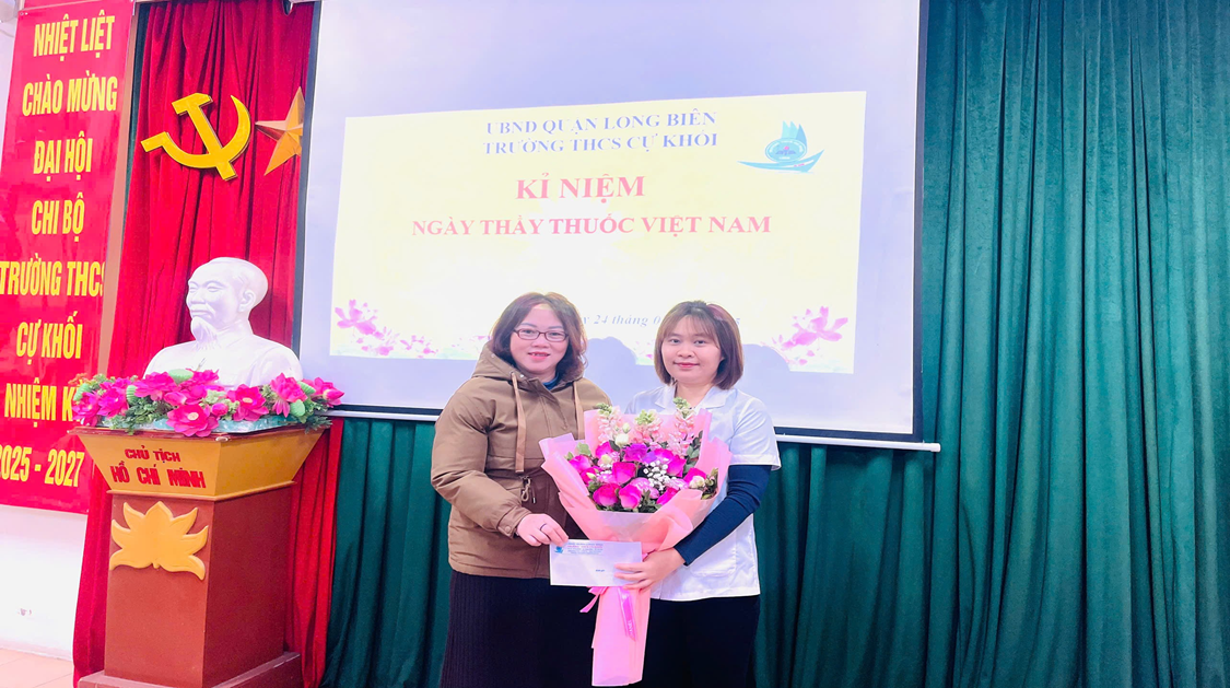 Sáng ngày 24/2, BGH, Công đoàn, học sinh trường THCS Cự Khối đã chúc mừng tặng quà tri ân và gửi những tình cảm chân thành, tốt đẹp nhất đến cô Tăng Thị Anh Đào - nhân viên Y tế nhà trường người đã luôn tận tụy với công việc, chăm sóc sức khỏe cho tất cả cán bộ, giáo viên, nhân viên và học sinh trong nhà trường nhân ngày Thầy thuốc Việt Nam 27/2.