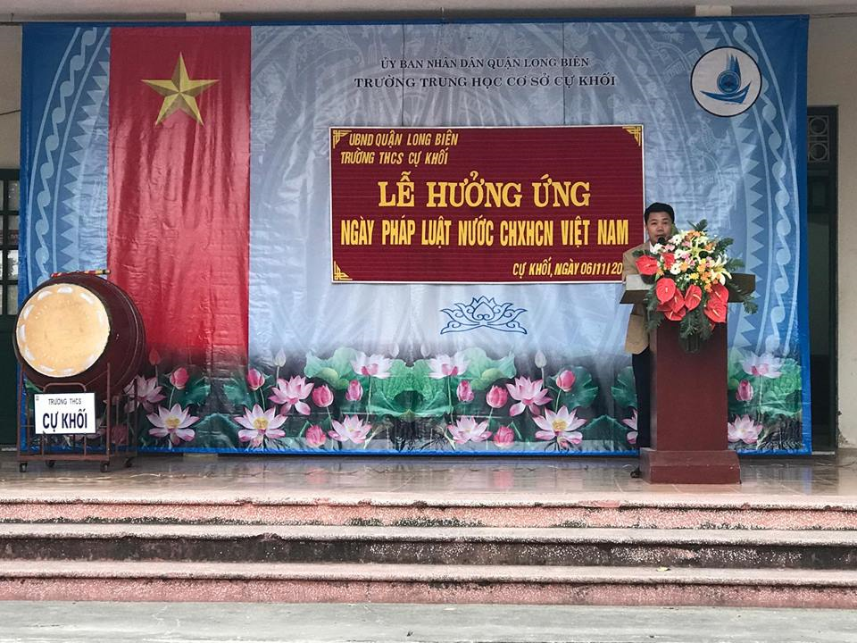 Sáng ngày 6/11/2017 trong buổi lễ chào cờ đầu tuần, thầy và trò trường THCS Cự Khối tổ chức buổi lễ "Hưởng ứng ngày Pháp luật nước CHXHCN Việt Nam 9/11". Với chủ đề “Nâng cao năng lực xây dựng, thực thi pháp luật; giáo dục ý thức tôn trọng, tuân thủ và nghiêm chỉnh chấp hành pháp luật; tạo môi trường thuận lợi cho sản xuất kinh doanh; phát huy dân chủ, bảo vệ quyền con người, quyền công dân”, nội dung tuyên truyền cho cán bộ, giáo viên, nhân viên và các em học sinh hiểu biết thêm về các điều luật sửa đổi, bổ sung của pháp luật và thực hiện tốt hiến pháp, pháp luật của nhà nước.