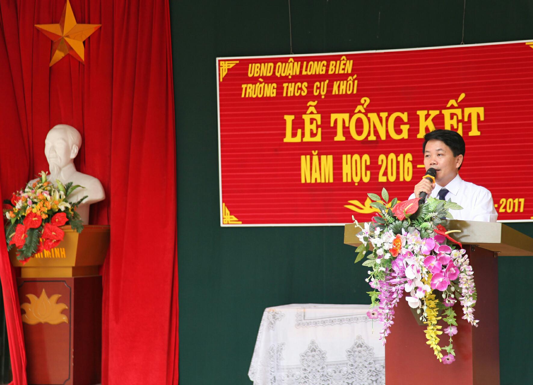 Tại buổi lễ, thầy giáo Dương Văn Tuynh – Bí thư chi bộ - Hiệu trưởng nhà trường đã đọc diễn văn bế giảng, tổng kết lại những thành tích mà thầy và trò trường THCS Cự Khối đã gặt hái được trong năm học 2016-2017, đồng thời gửi lời nhắn nhủ đến toàn thể các em học sinh. Nhà trường biểu dương, ghi nhận sự miệt mài, trí tuệ và tâm huyết của các thầy cô tham gia giảng dạy. Bên cạnh đó Ban giám hiệu nhà trường cũng gửi lời cảm ơn tới các cấp lãnh đạo, toàn thể CB-GV-NV nhà trường, các bậc PHHS… đã luôn tạo điều kiện để học sinh nhà trường đạt được những kết quả học tập và rèn luyện tốt nhất.