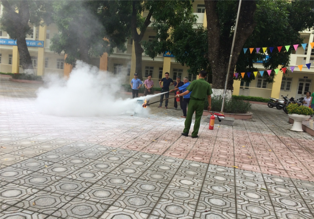 Sau thời gian học lý thuyết, CBGVNV nhà trường đã tích cực tham gia thực hành cách sử dụng các phương tiện bình bột, bình CO2 để dập tắt đám cháy và cách thức xử lý nhanh các tình huống có thể xảy ra.